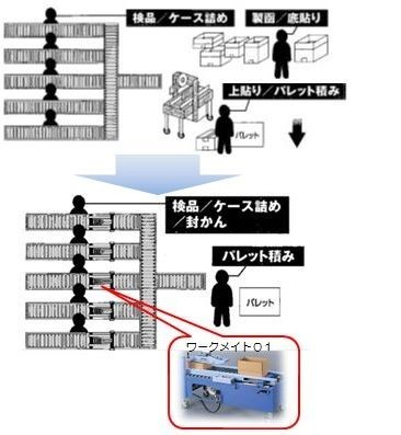 各ラインにワークメイト01を設置し、その場で製函・検品・ケース詰め・封かん作業を行えるようになりました。