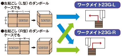 - 左起こし(L型)・右起こし(R型)、双方のダンボールケースを1台で対応
